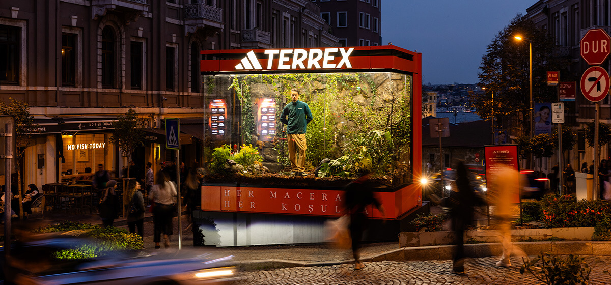 Adidas Terrex markasının 'Her Macera, Her Koşulda' vizyonunu İstanbul Akaretler’de yerini aldı. Estetik ve mühendisliği bir araya getiren bu özel kiosk projesinde, yaşayan bir doğa alanı kurguladı. İçerisinde yer alan döngüsel yağmurlama sistemi olan bu kiosk, kentsel doku içerisinde nefes alan bir durak noktası oluşturdu.
